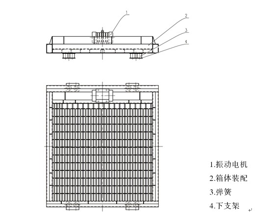 振動篦板由振動體、振動電機、支撐彈簧、彈簧支座等組成。篦板為焊接結構,篦孔尺寸根據物料種類和用戶要求而定。篦板的支撐彈簧為橡膠彈簧或螺旋鋼制彈簧,根據現場的安裝環境,彈簧或者布置在篦板的兩個側邊下部,或者布置在篦板的四個邊的下部。